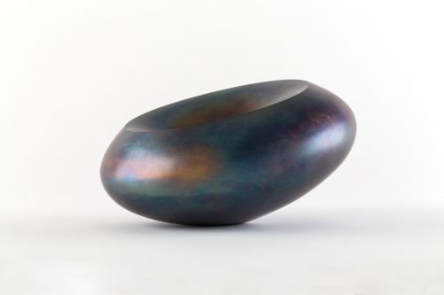 Adi Toch, Small Purple Patinated Vessel, , 2020, patina on silver plated base metal, loose hematite spheres, 5,5 x 10 x 10 cm, unique piece, € 1.800 /Blue Vessel Whispering Bowl, Adi Toch, 2020, patina on silver plated base metal, loose hematite spheres, 7 x 14 x 14 cm, unique piece, € 2.900